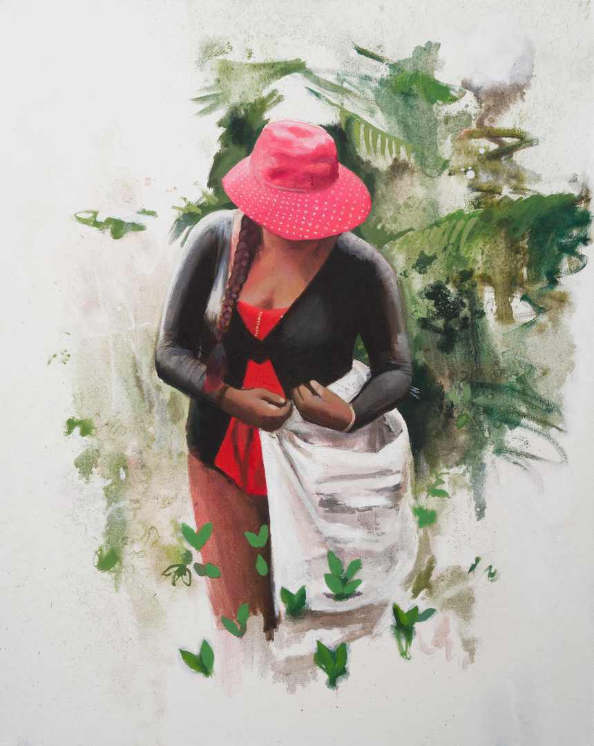 Lady picking Coca, 2025, Oil / Canvas, 100 x 90 cm